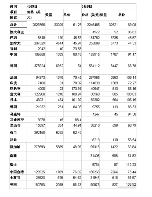 09年4、5月份美國鎢粉出口量值統計